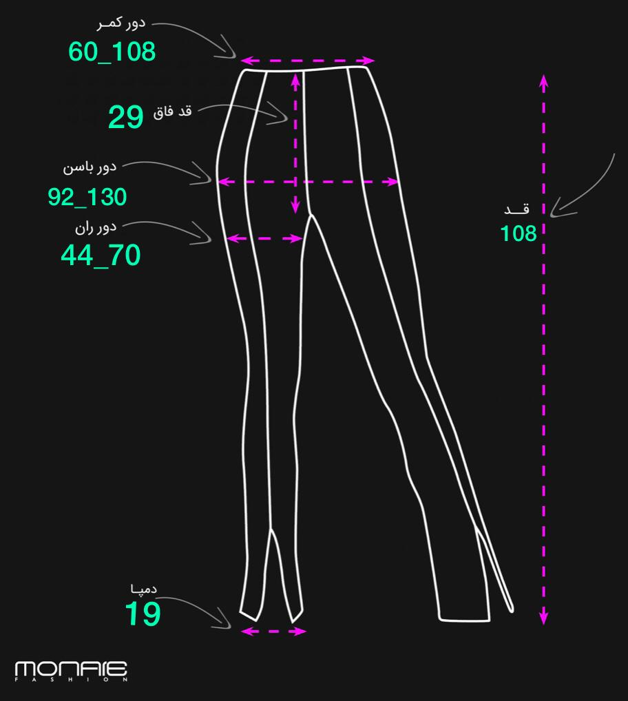قد | دمپا | قد فاق | دور کمر | دور کمر (با احتساب کش) | دور باسن | دور باسن (با احتساب کش) | دور ران | دور ران (با احتساب کش) | سایز |