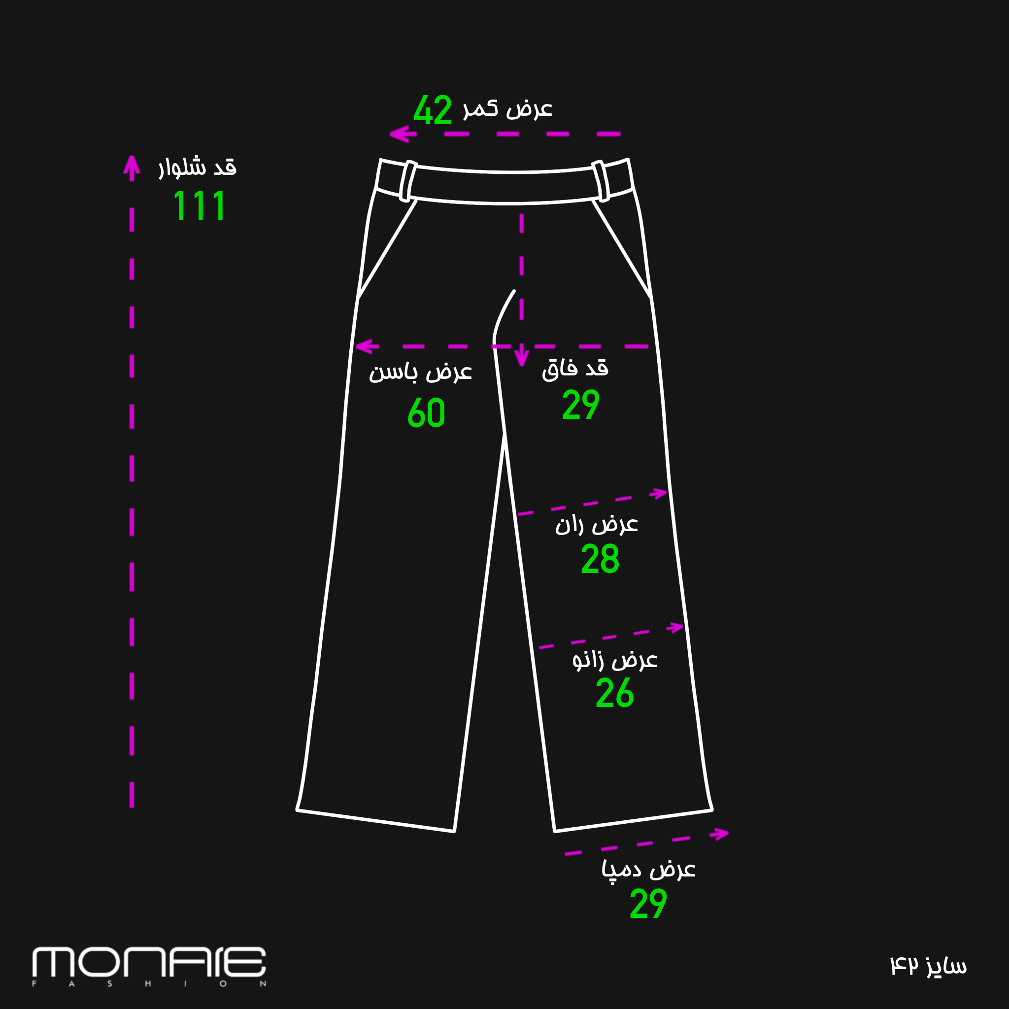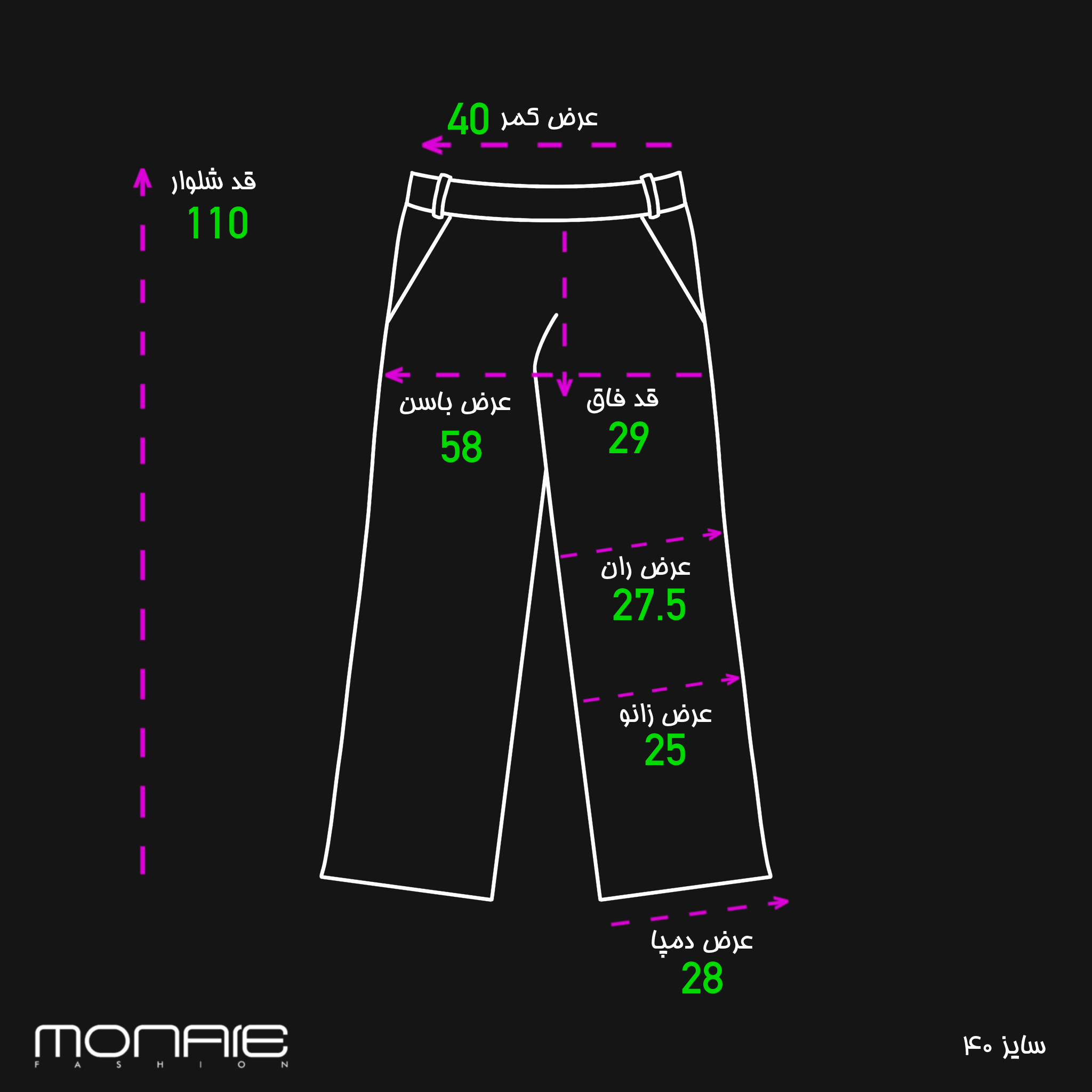 قد شلوار | عرض دمپا | عرض زانو | عرض ران | قد فاق | عرض باسن | عرض کمر | سایز |