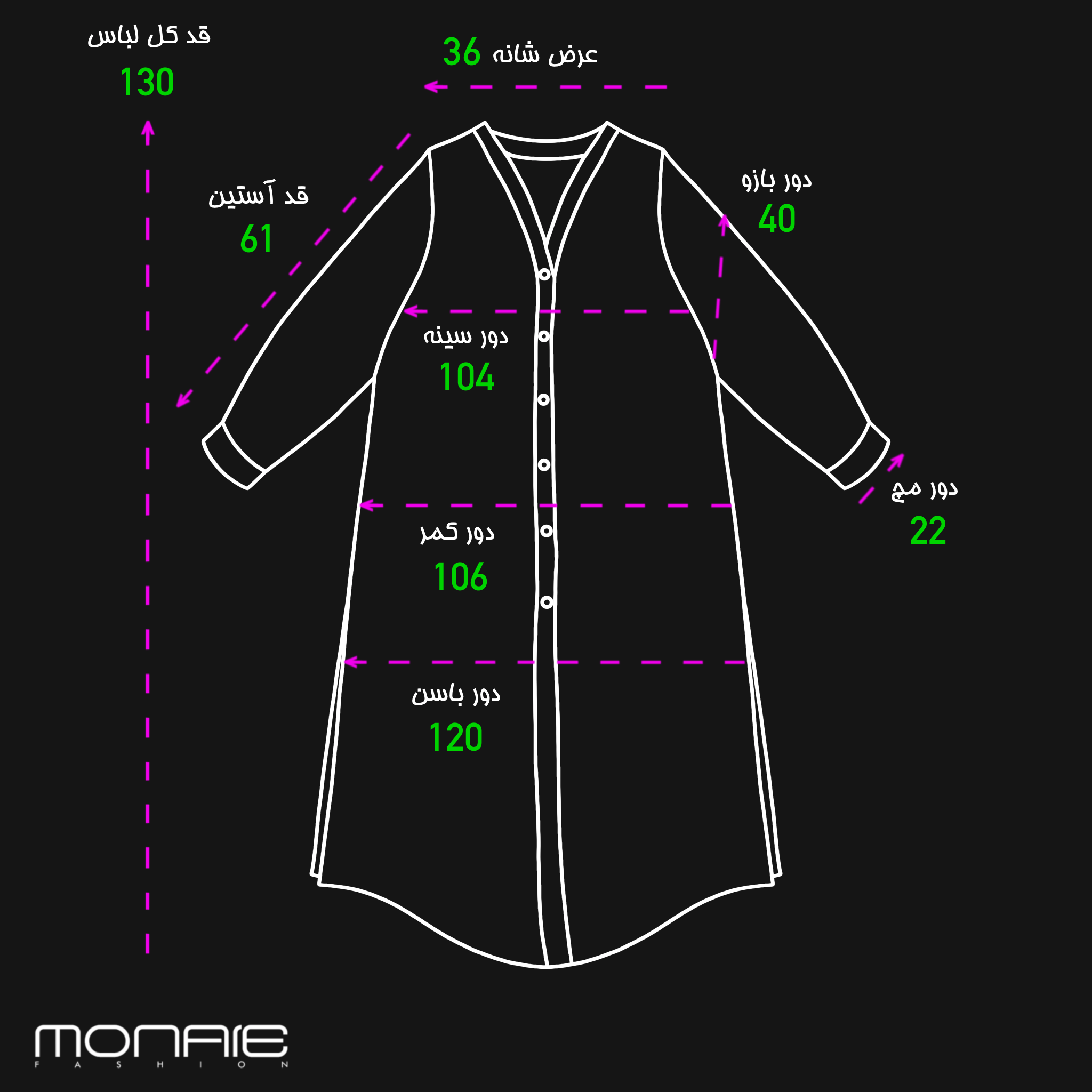 130cm | 61cm | 22cm | 40cm | 120cm | 106cm | 104cm | 36cm | فری سایز (مناسب 36 تا 42) |