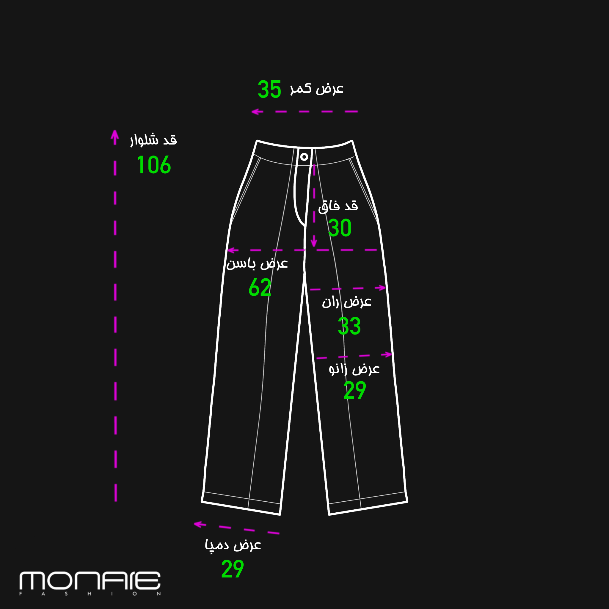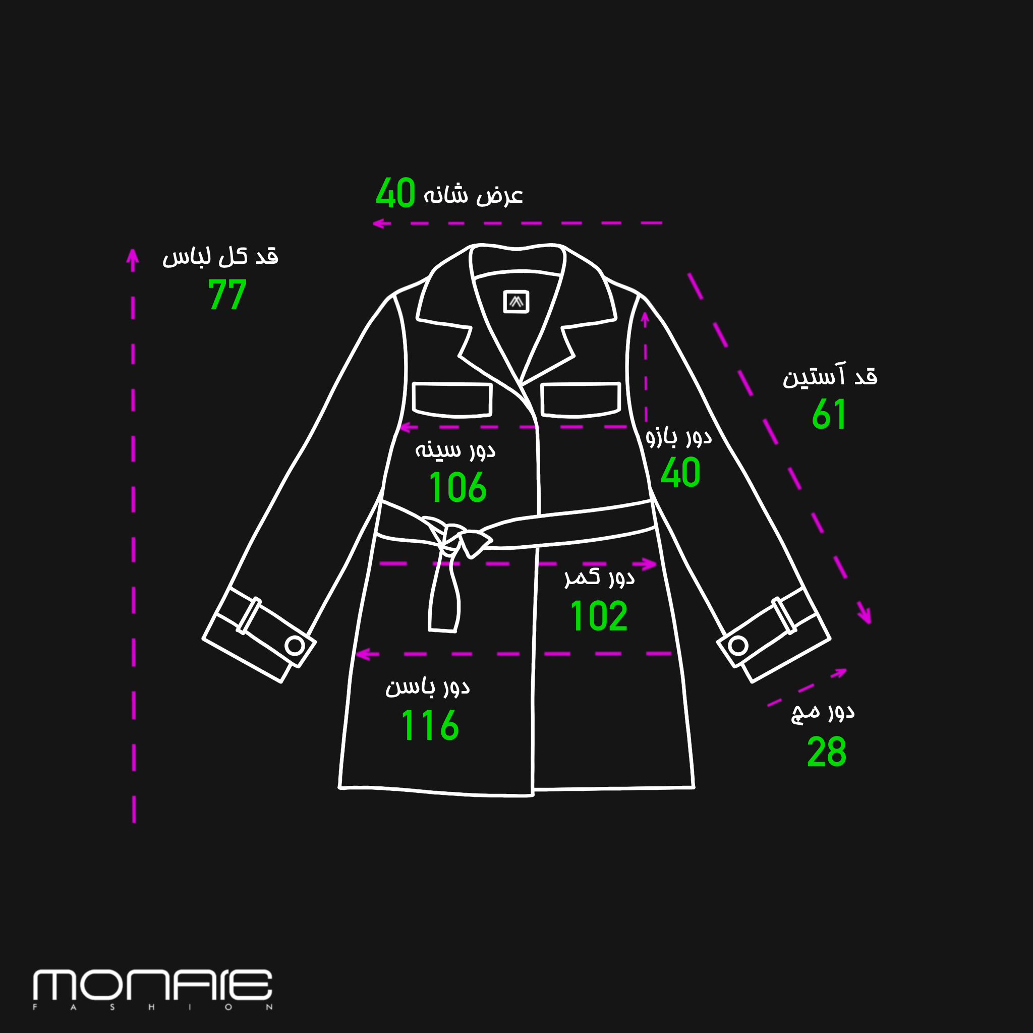 106cm | 29cm | 29cm | 33cm | 30cm | 62cm | 35cm | 77cm | 61cm | 28cm | 40cm | 116cm | 102cm | 106cm | 40cm | سایز 2(مناسب 40/42) |