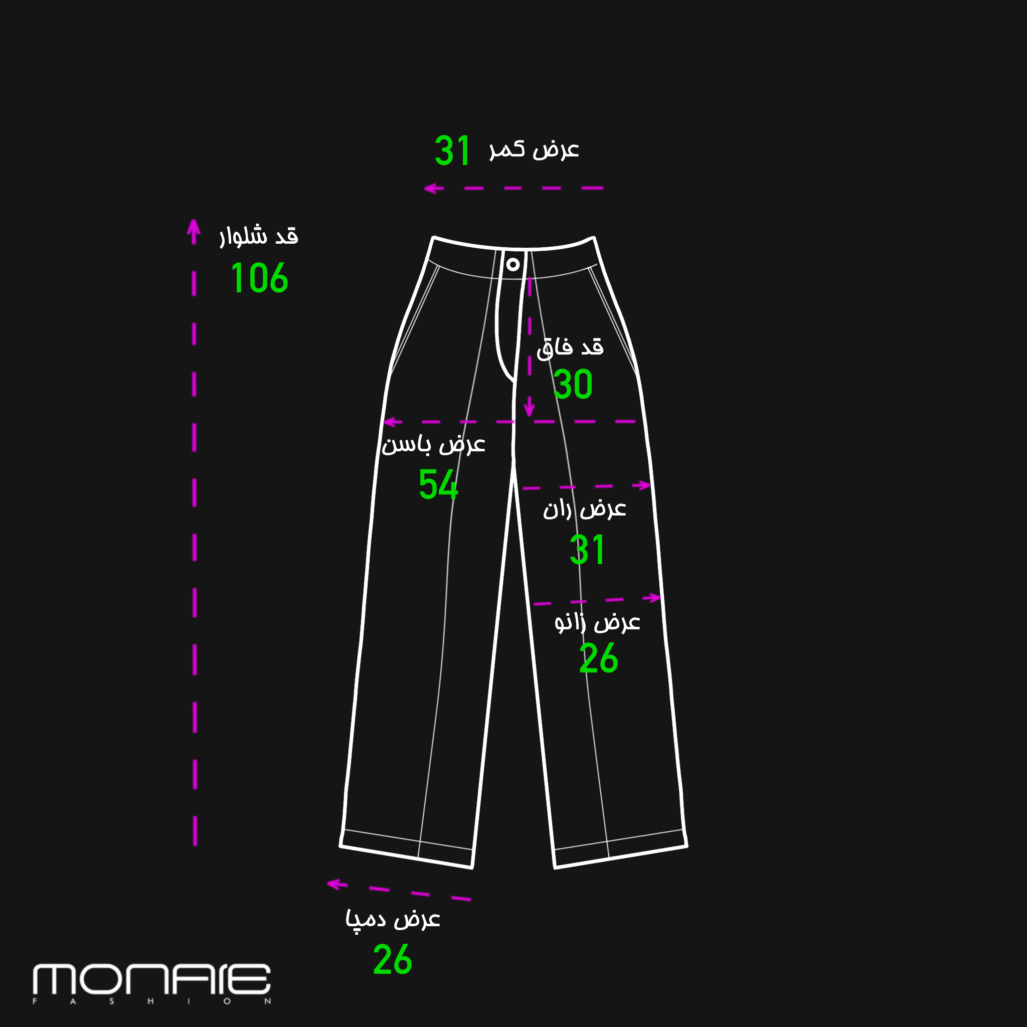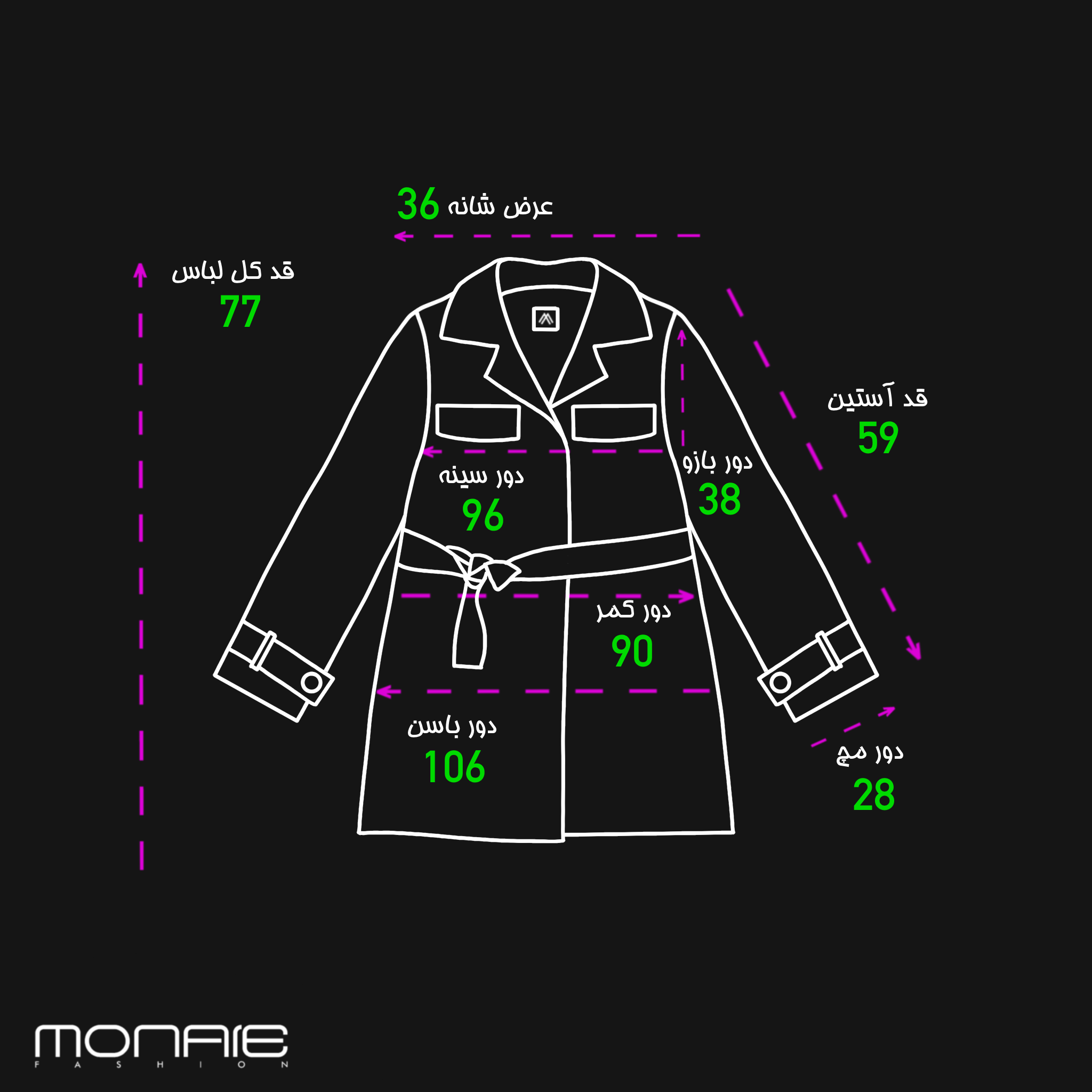 106cm | 26cm | 26cm | 31cm | 30cm | 54cm | 31cm | 77cm | 59cm | 28cm | 38cm | 106cm | 90cm | 96cm | 36cm | سایز 1(مناسب 36/38) |