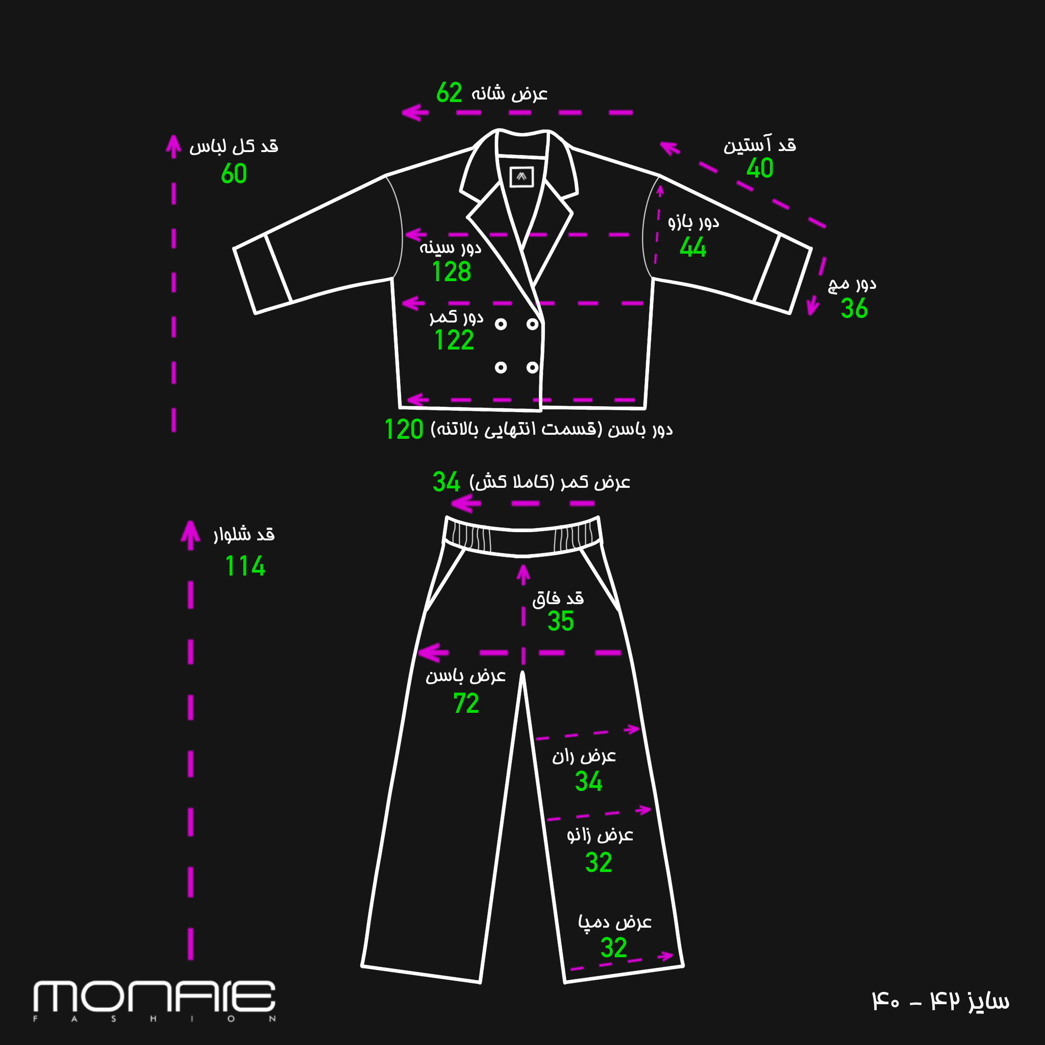114cm | 32cm | 32cm | 34cm | 35cm | 72cm | 34cm | 60cm | 40cm | 36cm | 44cm | 120cm | 122cm | 128cm | 62cm | سایز 2 (مناسب 40/42) |